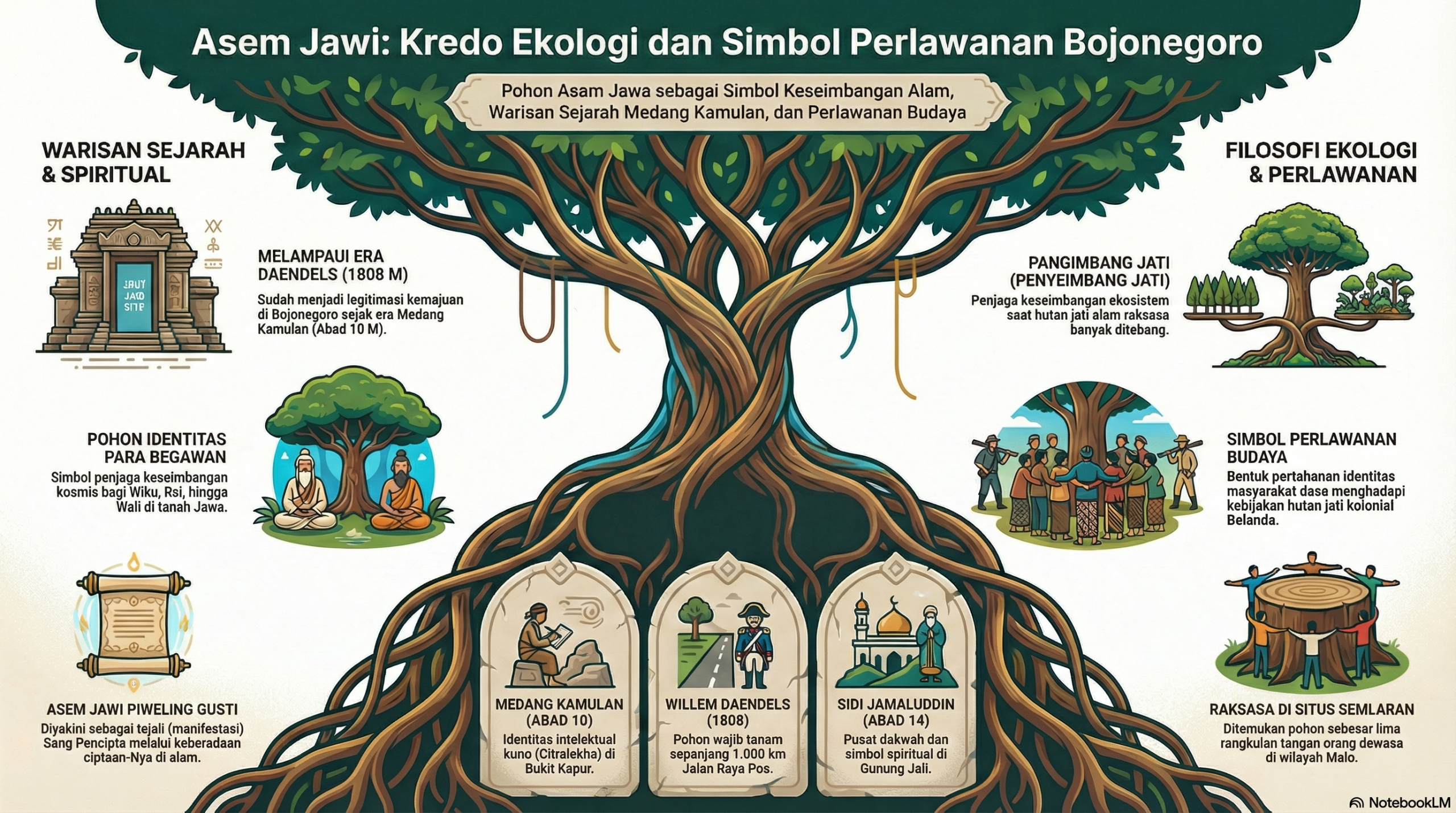 Bojonegoro tentu masyhur wilayah hutan jati alam raksasa. Pada 1810 M, seorang pelancong Belanda bernama Pieter Gulin menceritakan bahwa wilayah Bojonegoro dipenuhi hutan jati alam raksasa. Keberadaan jati-jati raksasa itu, bukan berada di dalam hutan monokultur. Tapi multikultur, berdampingan dengan beragam pohon lainnya. Termasuk Pohon Asam Jawa raksasa.
