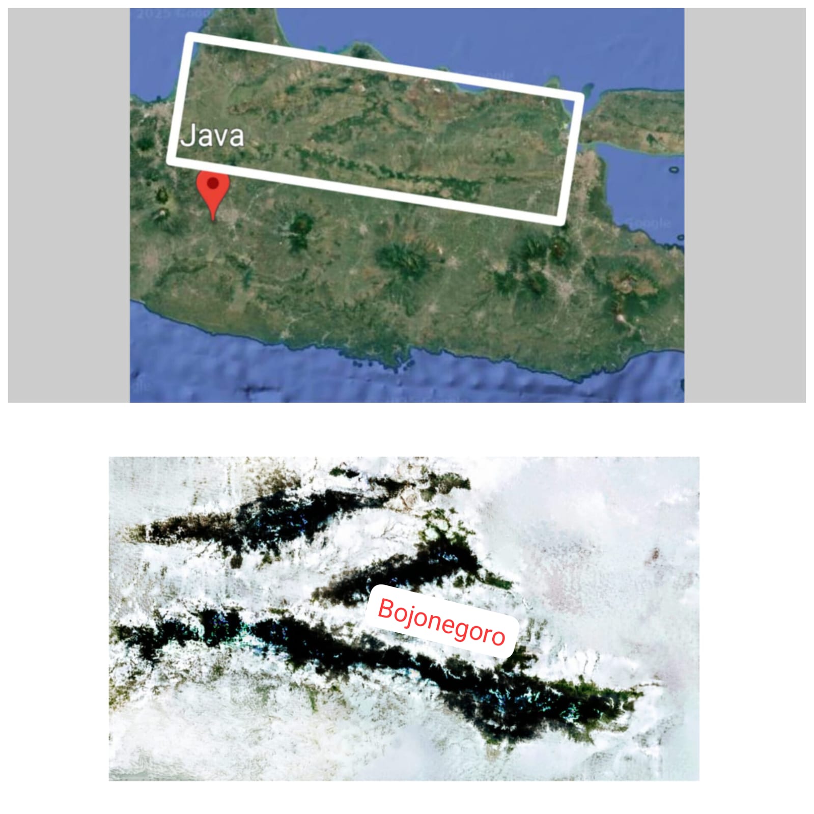 Atas: posisi Kendeng Utara di Pulau Jawa. Bawah: tiga lajur Kendeng Utara dan posisi Bojonegoro yang berada di tengahnya (Jurnaba, 2025)