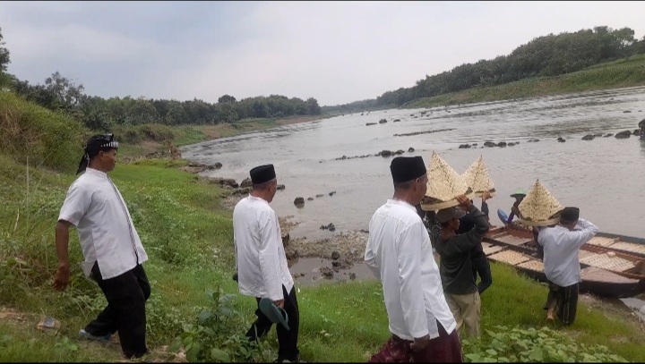 Setelah didoakan, ambeng doa diantar menggunakan perahu, ke pusat acara.