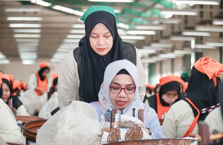 Mengunjungi para karyawan dari proses menggulung, press, packaging, membuat Cantika Wahono kian kagum. Dengan ramah, ia bertanya banyak hal pada ibu-ibu tersebut.