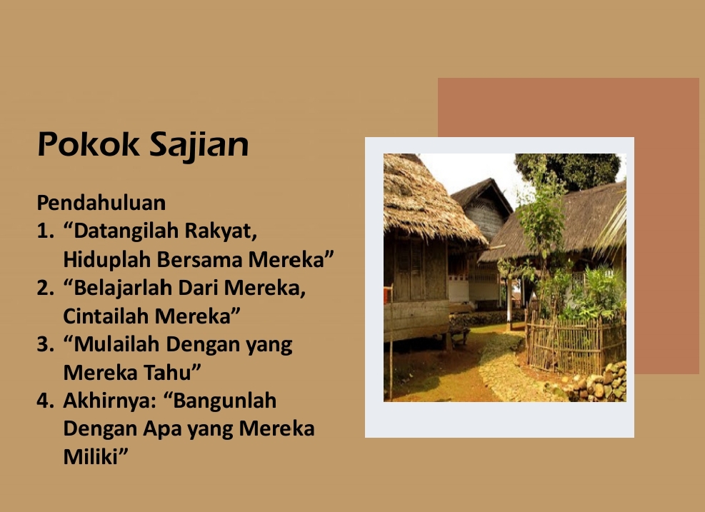 Yang menarik, judul bab per bab dalam naskah ini diambil dari bait puisi Lao Zi di atas. Mulai dari (1), Datangilah masyarakat, hiduplah bersama mereka; (2), Belajarlah dari mereka, cintailah mereka; (3), Mulailah dengan yang mereka tahu; dan (4), Bangunlah dengan apa yang mereka miliki.