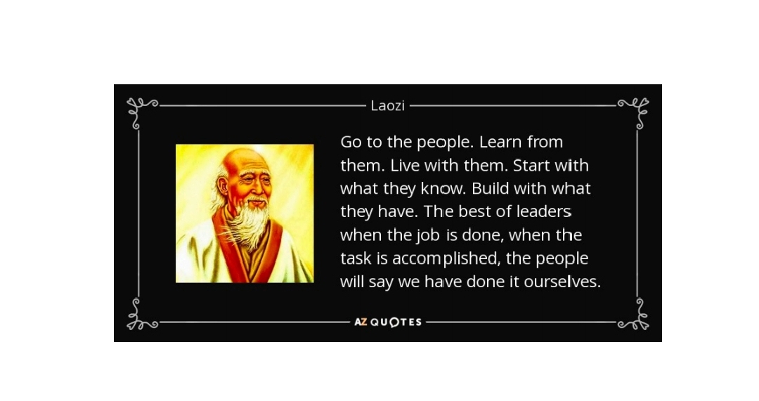Datangilah masyarakat, hiduplah bersama mereka; belajarlah dari mereka, cintailah mereka; mulailah dengan yang mereka tahu; bangunlah dengan apa yang mereka miliki. Ketahuilah, pemimpin terbaik adalah ketika pekerjaan selesai dan tugas telah dirampungkan, masyarakat akan berkata: “Kami sendirilah yang mengerjakannya” — Lao Zi.