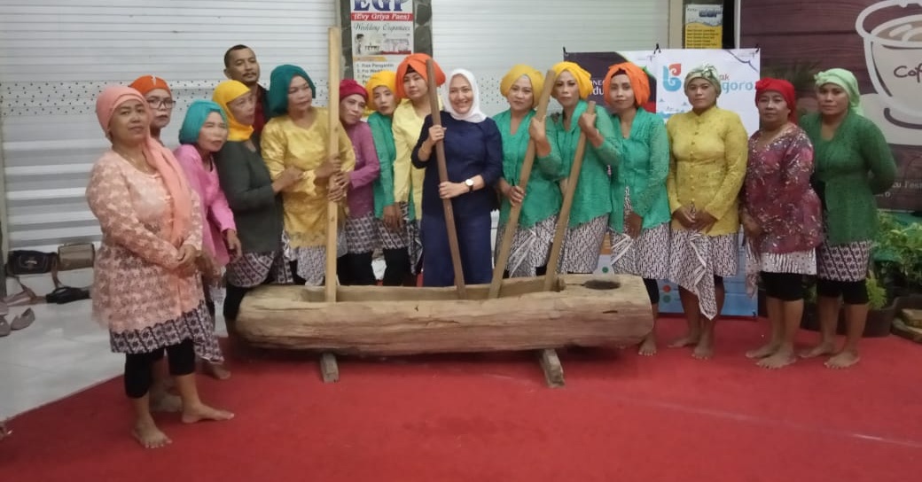 Mengetuk Harmoni Lesung: Bupati Anna Muawanah bersama ibu-ibu dari kelompok lesung Merana Jaya tampak akrab bersama.