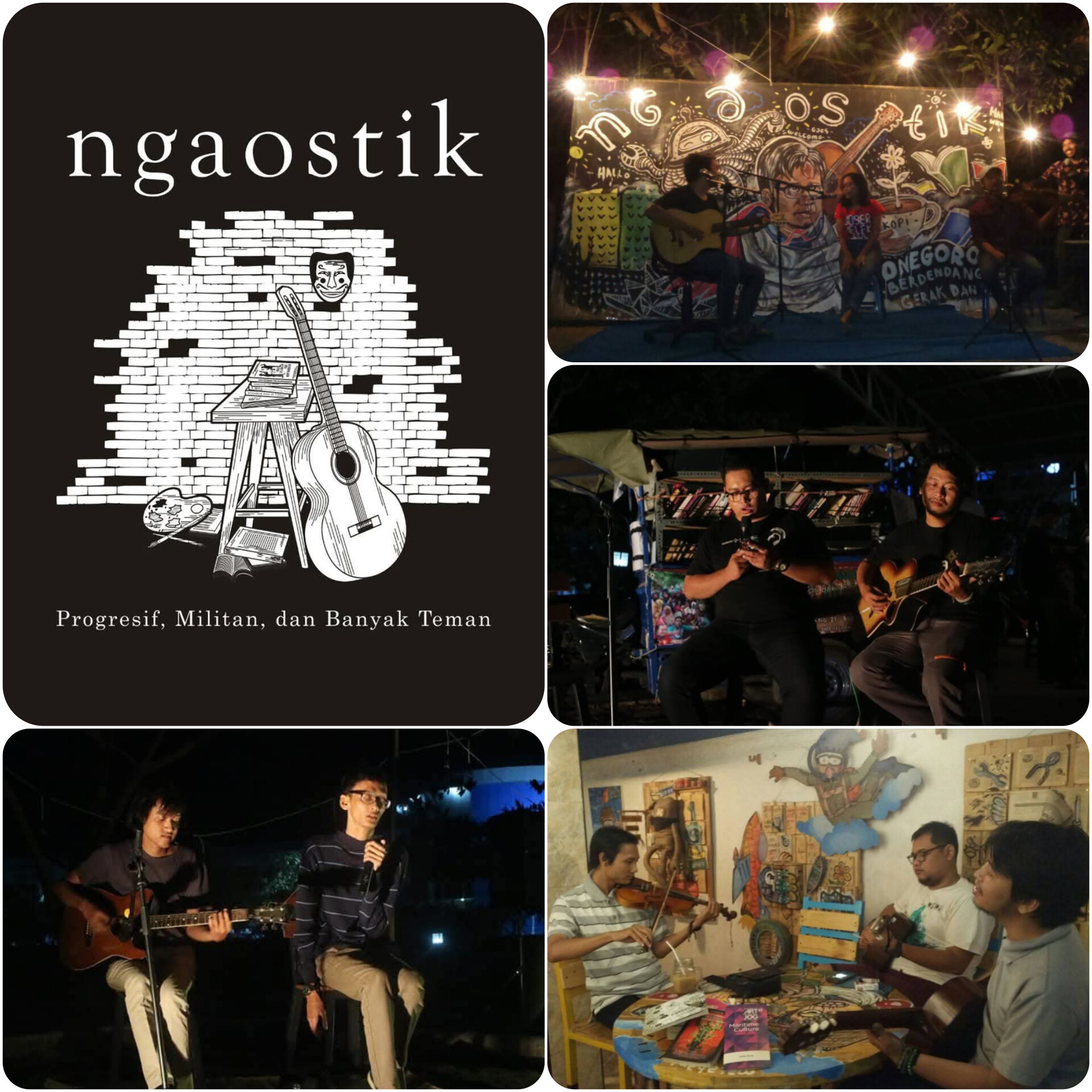 NgaostikFest mengkolaborasi musik dan buku. Sekaligus menjadi ruang lebur antara sunyi dan syahdu: kesunyian membaca buku, dan kesyahduan mendengar lagu. Ngaostik mengkolaborasikan 4 unsur seni sekaligus; sastra, musik, teater, dan seni rupa, kedalam satu paket pertunjukan.