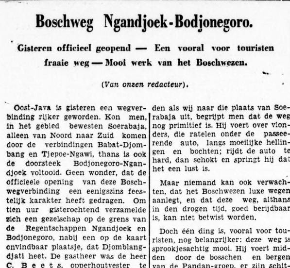 Bahkan Belanda juga membangun akses jalan untuk menghubungkan Bojonegoro dan Nganjuk, agar meningkatkan daya tarik wisatawan. Seperti dilaporkan dalam surat kabar Soerabaijasch Handelsblad pada tahun 1935, jalan tersebut diresmikan dengan upacara meriah. Rombongan pejabat kolonial, termasuk kepala kehutanan Ngajuk, Bupati Bojonegoro dan Ngajuk, serta beberapa pejabat penting lainnya, berkumpul di perbatasan kedua kabupaten. Setelah itu, mereka melanjutkan perjalanan ke Pesanggrahan Klino, di mana mereka disambut dengan jamuan minuman di taman pesanggrahan.