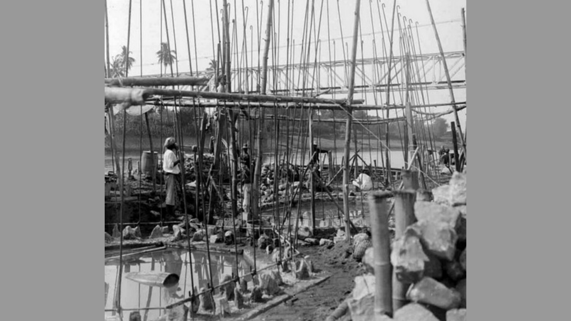 Para pekerja lokal bertugas menggali bawah air tanpa alat selam, sementara sumur-sumur yang digali dipompa untuk menjaga kejernihan air. Setelah mencapai kedalaman yang ditentukan, sumur-sumur tersebut diisi dengan beton yang terdiri dari campuran kapur, pasir, dan kerikil dari Sungai Solo.
